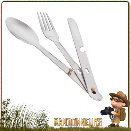 Set couverts de camping Inox (couteau, cuiller, fourchette) robuste en acier inoxydable, pratique avec son clip de fixation pour regrouper ses éléments pendant le transport