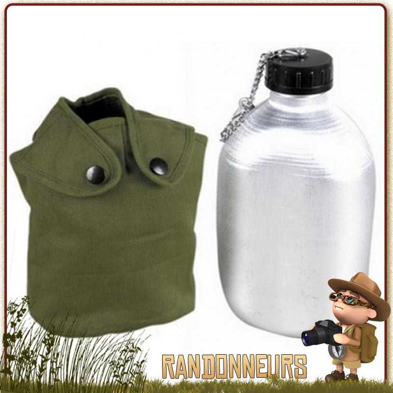 Gourde Armée GI avec housse Vert Olive Rothco - Gourde armée type GI's en aluminium avec housse. Gourde militaire de l'armée américaine avec bouchon plastique et chainette de maintien. Volume utile 95 cl. Une gourde militaire tout alu, légère et robuste, idéale pour le bushcraft nature. Fourni avec housse polyester