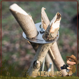Le disque léger en acier inox constitue la base pour un trépied de suspension que vous pourrez concevoir avec des branches taillées n'importe où dans la nature.